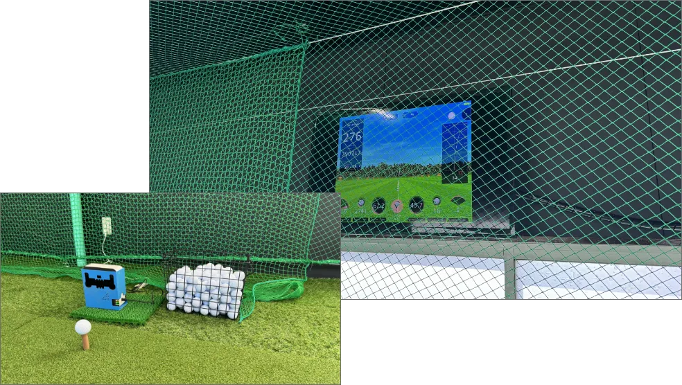 奥行きが15ヤードほどあるショット練習場。ドライバーからアイアンはもちろんのこと手前からアプローチ練習もできるよう通常マット、そしてラフのマットも準備しております。